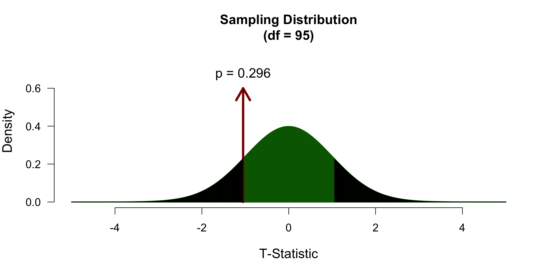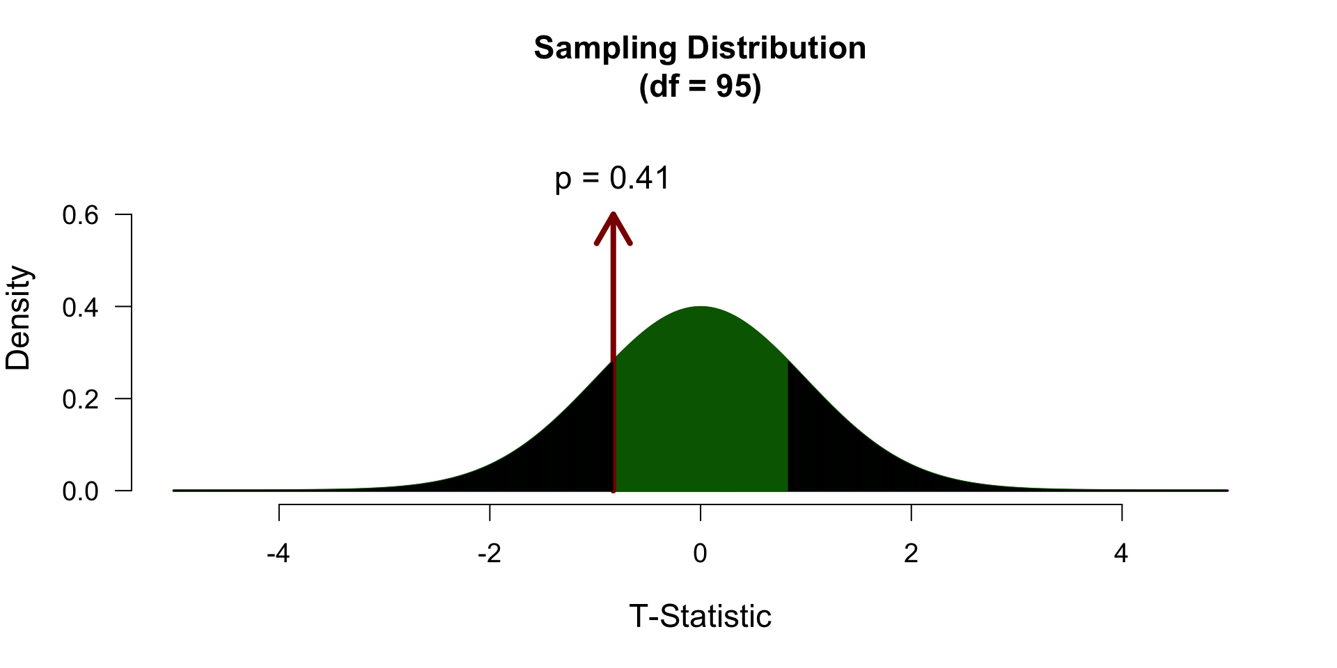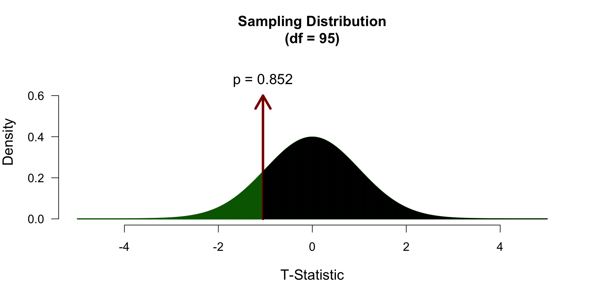 Finally we have to calculate our \(p\)-value for which we need the degrees of freedom \(df = n - 1\) to determine the shape of the t-distribution.
