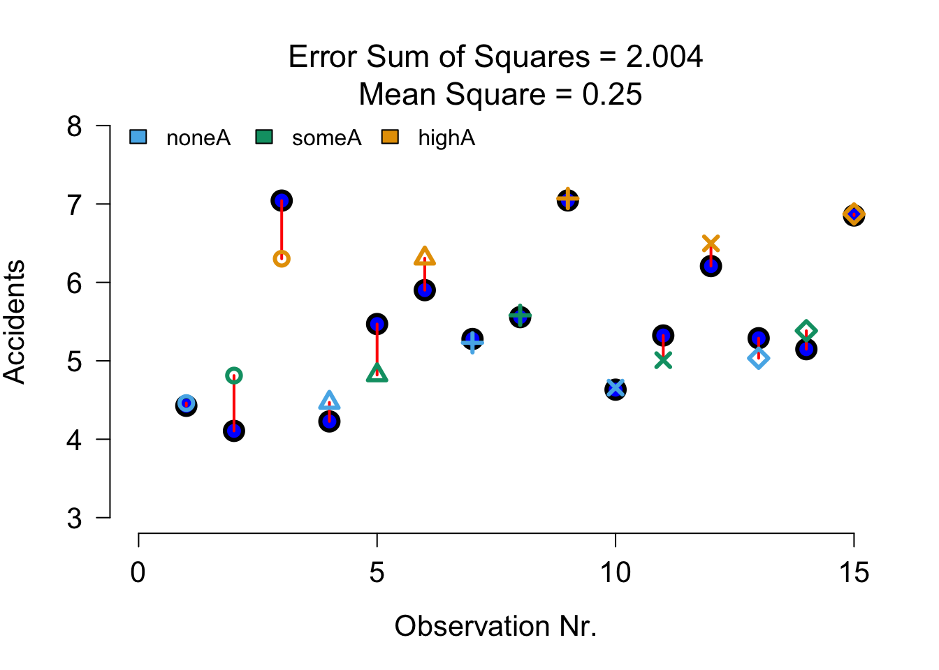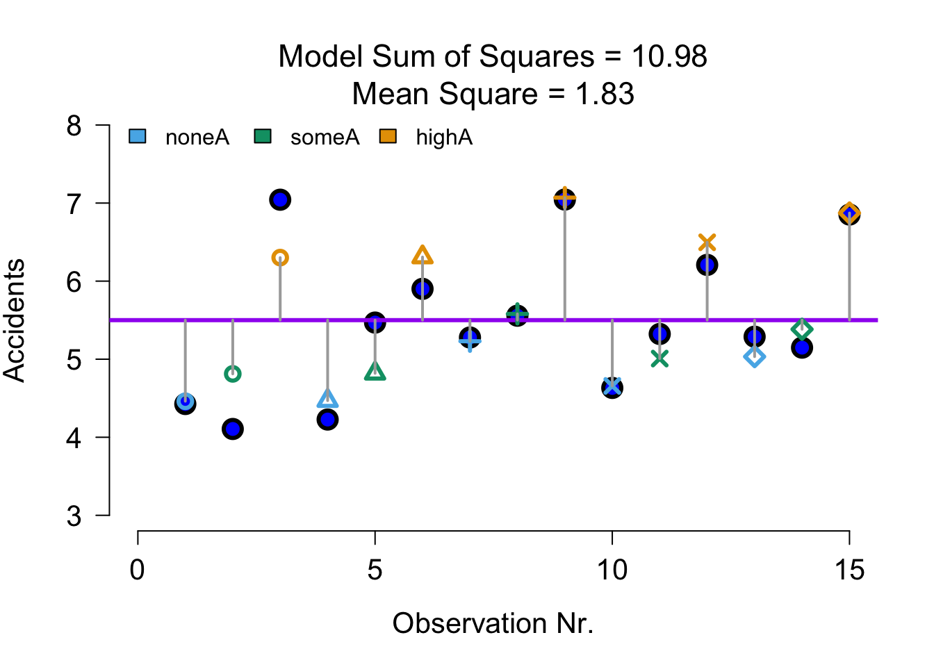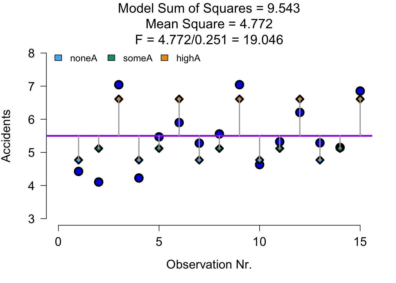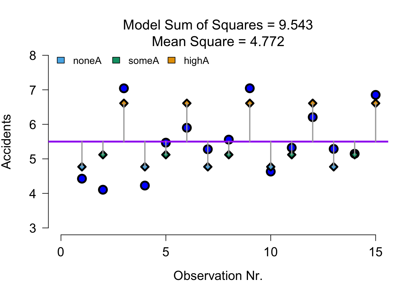 In this example we will again look at the amount of accidents in a car driving simulator while subjects where given varying doses of speed and alcohol. But this time we lat participants partake in all conditions. Every week subjects returned for a different experimental condition.