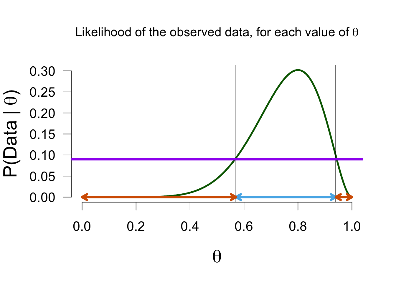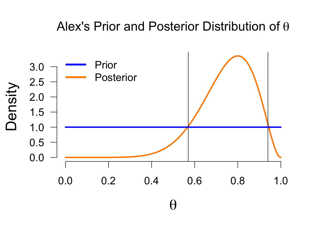 In the Bayesian framework, this is known as the credible interval. This interval entails taking the middle \(x\)% of the posterior distribution. For instance, we can take a 95% credible interval, which ranges from \(0.482\) to \(0.940\) in this case. This means that under Alex’s model, there is a 95% probability that the true value of \(\theta\) is between \(0.482\) and \(0.940\).