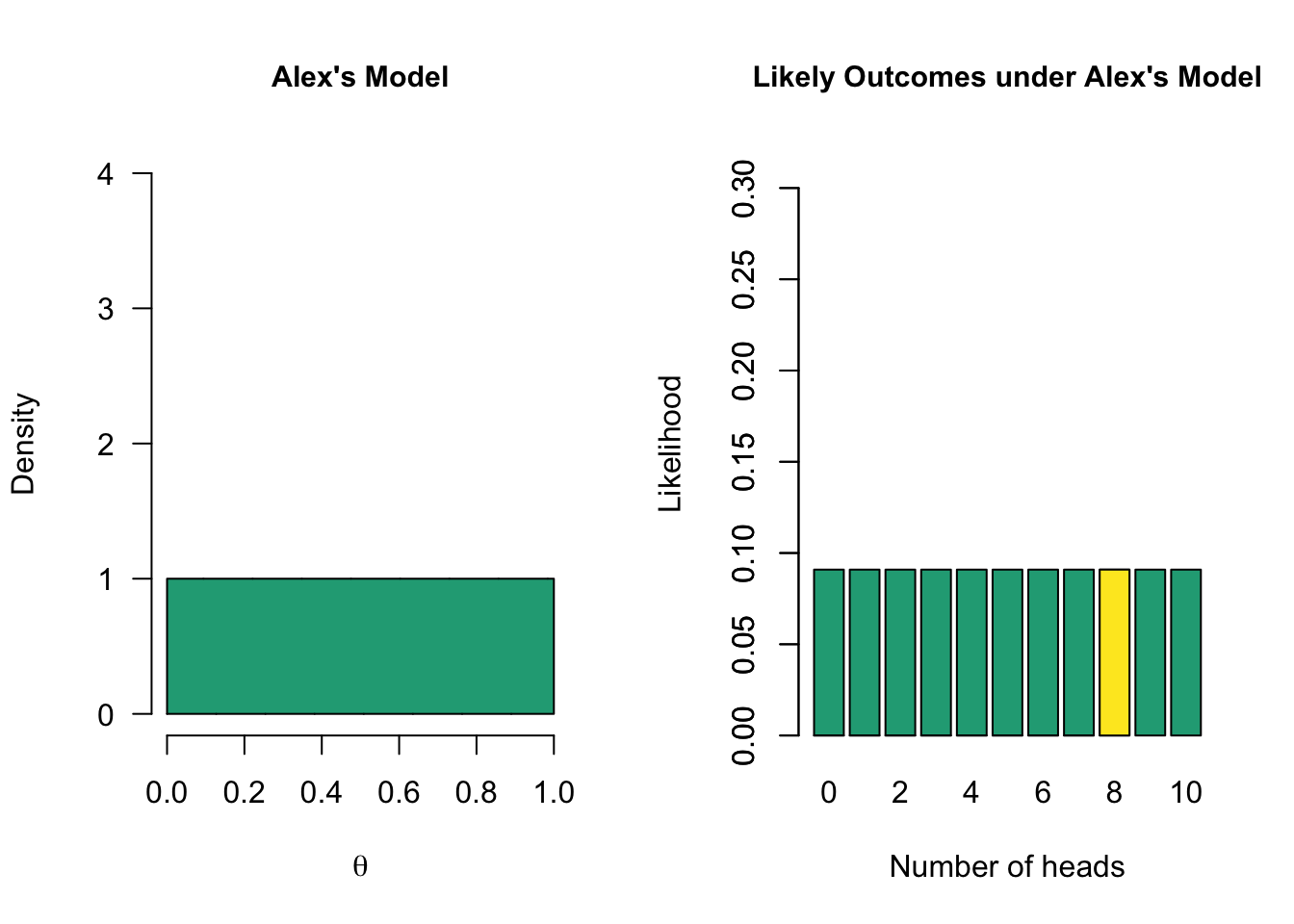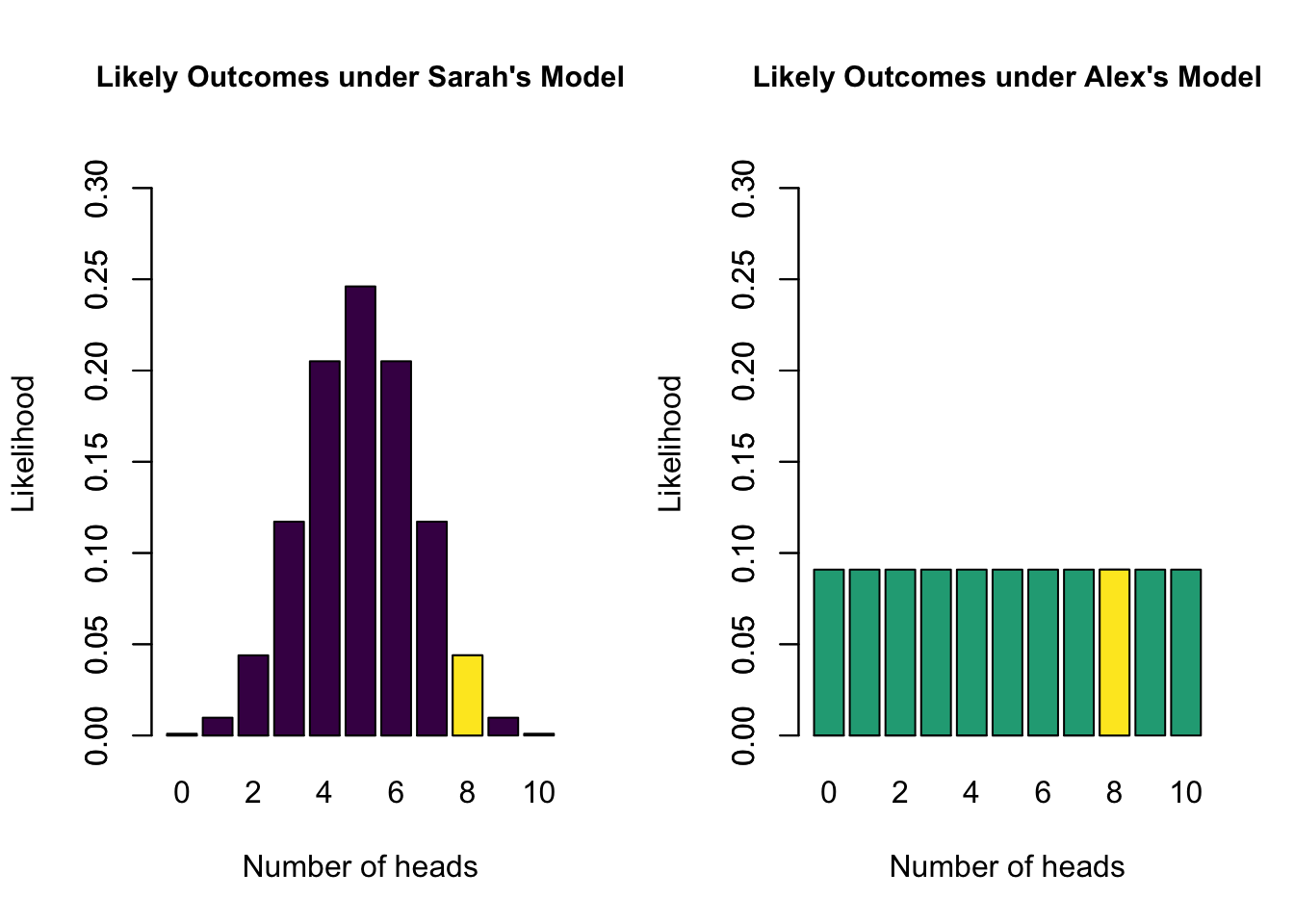 - Alex’s model has a marginal likelihood of 0.09 for 8 heads
