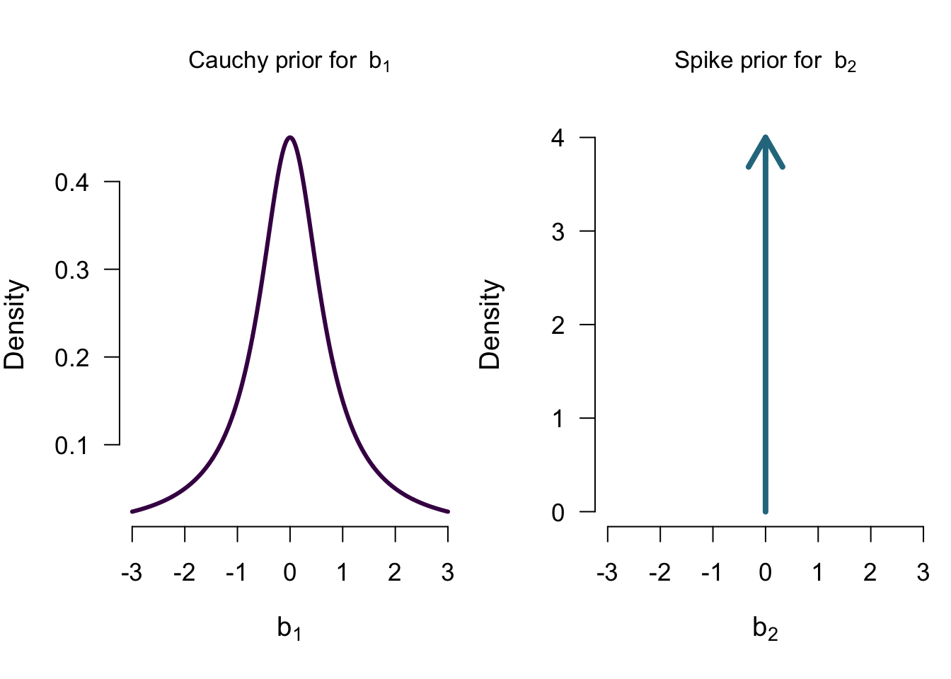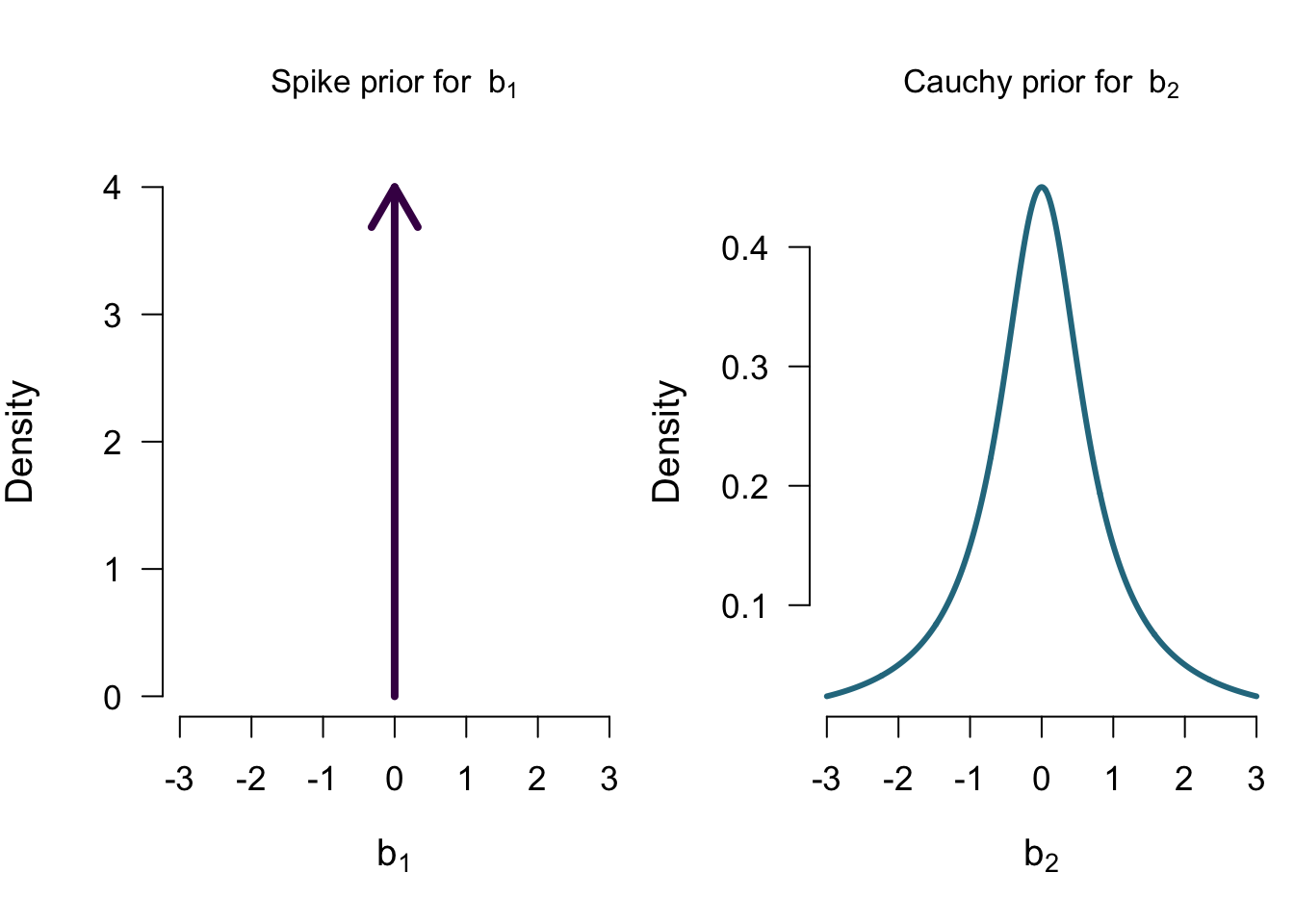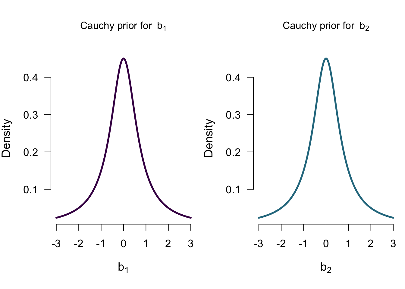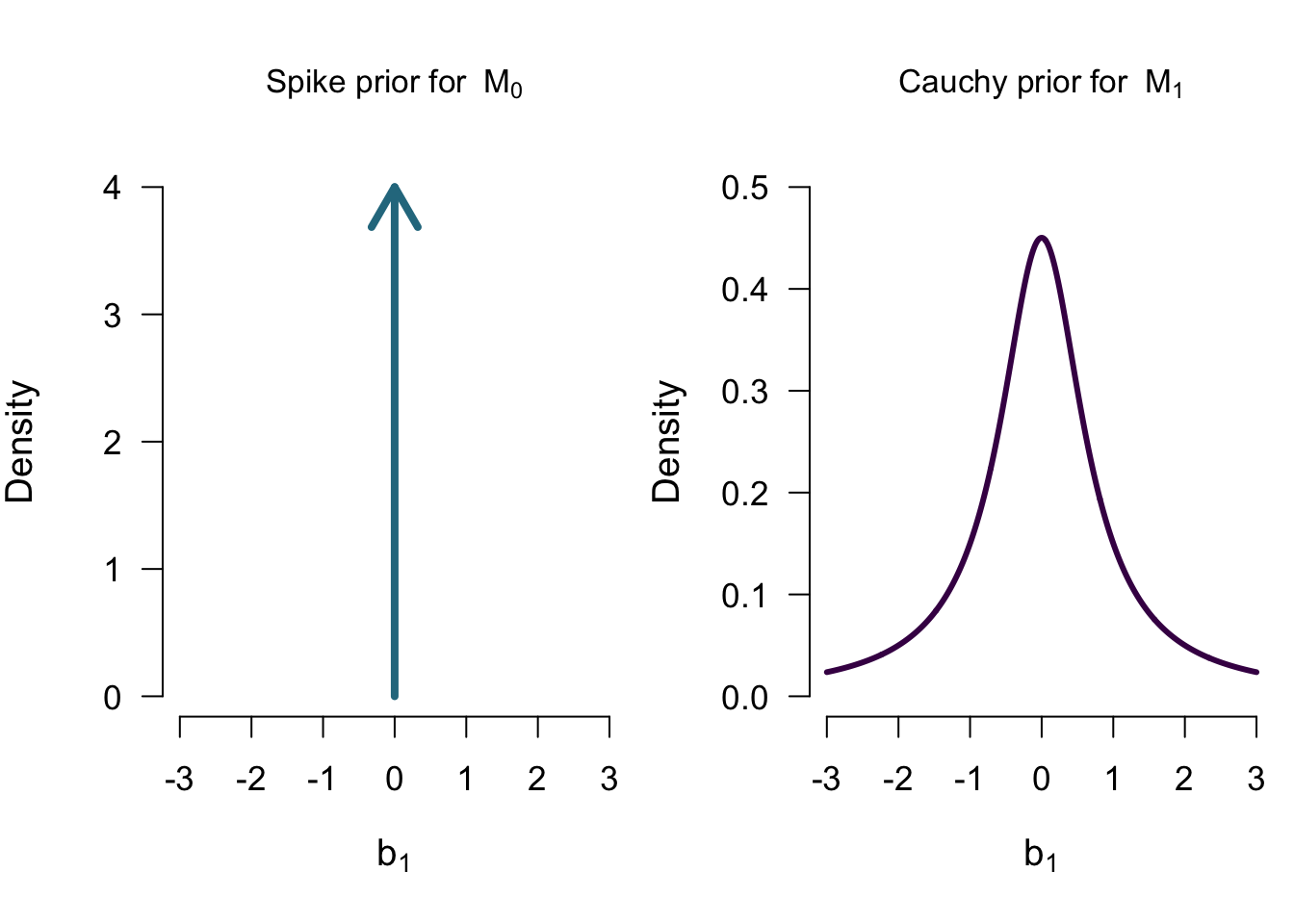 \[\mathcal{M_0}: b_1 = 0 \] \[\mathcal{M_1}: b_1 \sim Cauchy(0.707)\]