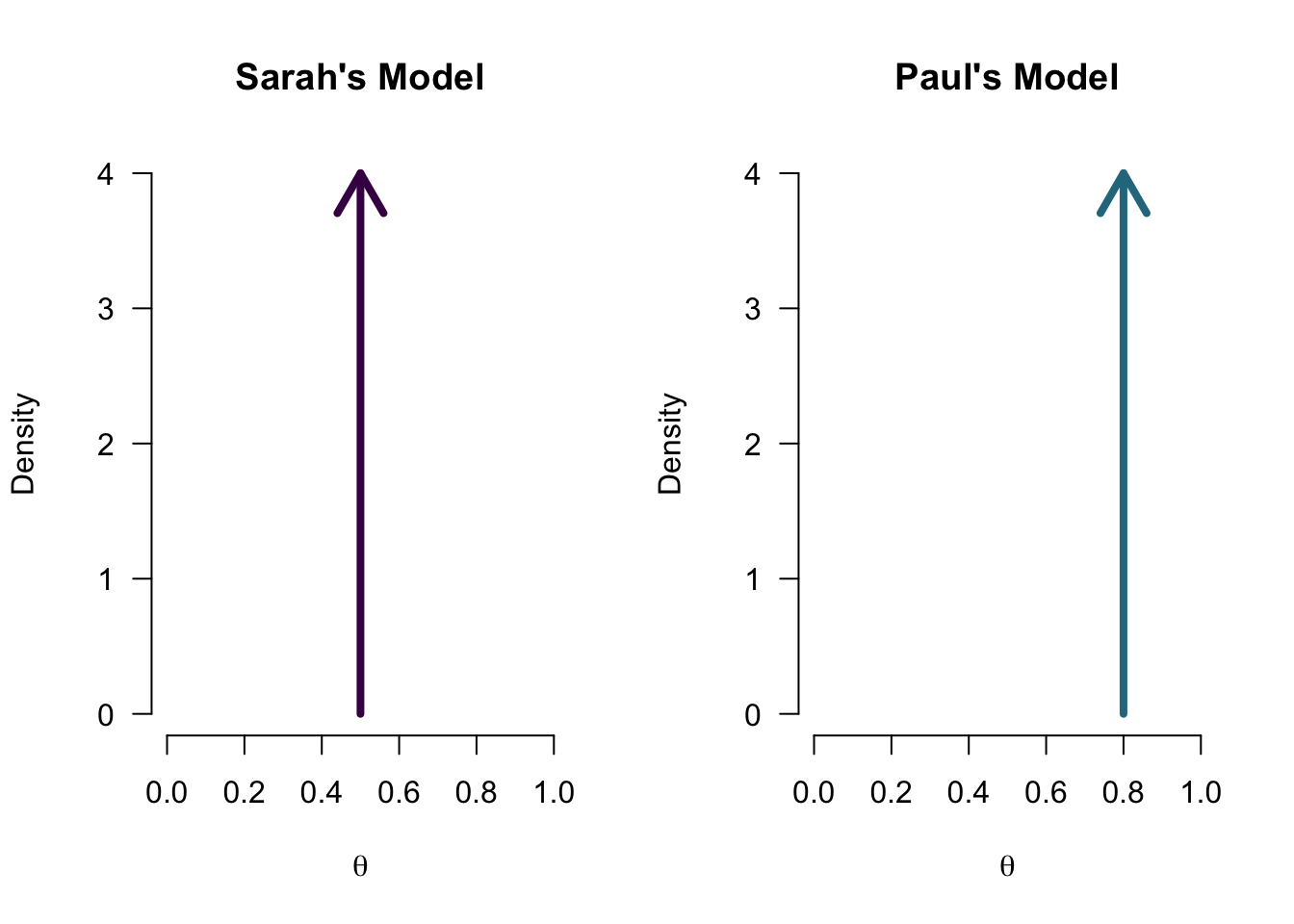 Each model has assigned a prior probability distribution to the parameter \(\theta\) by means of a probability distribution. In the case of a proportion, a convenient distribution is the Beta distribution because it also has a domain of [0,1].