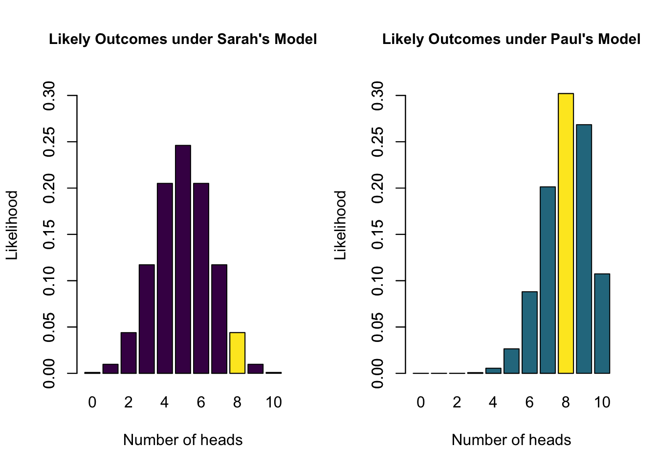 - Sarah’s model has a marginal likelihood of 0.04 for 8 heads