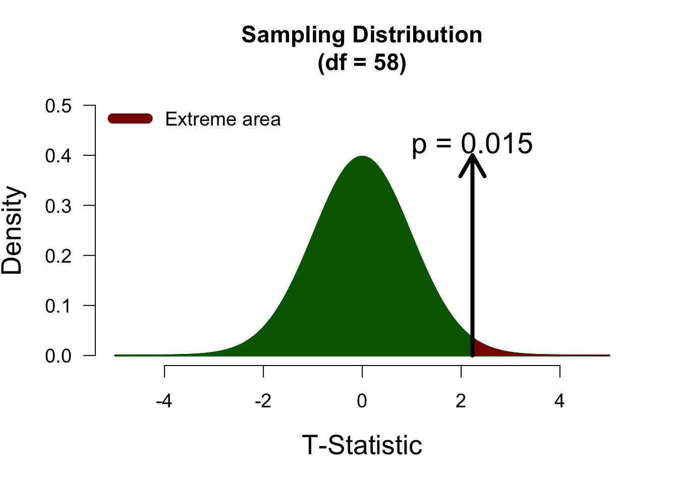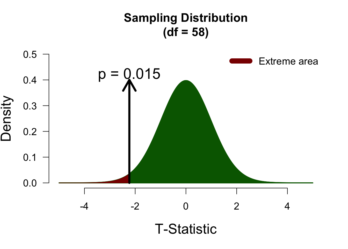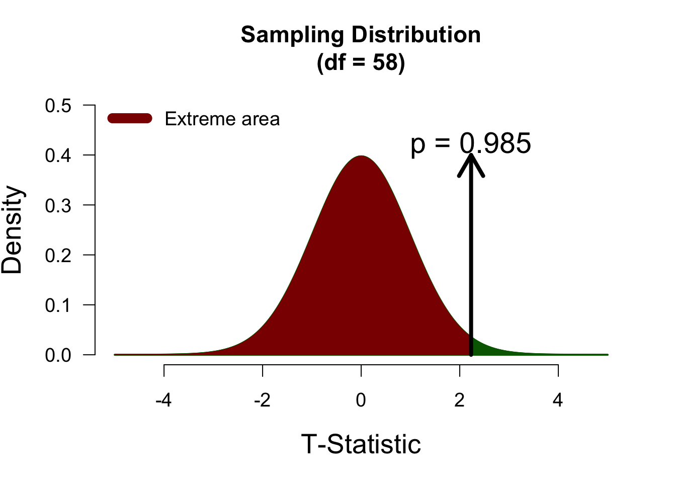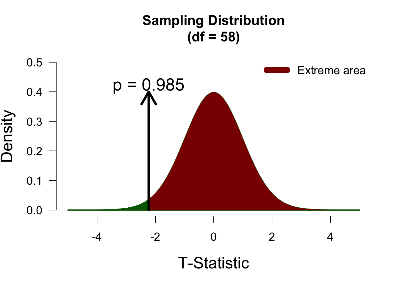 In a two-sided test, t-values of 2 and -2 will yield identical p-values, since we consider both tails of the sampling distribution as “extreme”. Below, both tails are highlighted in darkred, to indicate that both are counted towards the p-value.